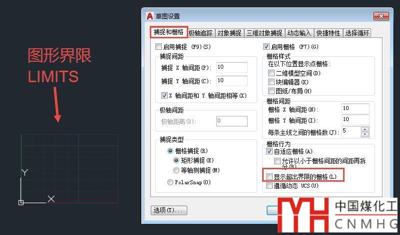 我們不妨通過(guò)一個(gè)簡(jiǎn)單的測(cè)試來(lái)看一下。開一張空?qǐng)D,打開柵格顯示,并將柵格設(shè)置成不“顯示超出界限的柵格“,如下圖所示。