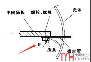 若換熱器雙殼程縱向隔板密封不嚴(yán),會(huì)導(dǎo)致殼程之間介質(zhì)短路,換熱效果達(dá)不到設(shè)計(jì)要求。殼程隔板的密封包括其與管板、殼程筒體兩處,隔板與管板多采用焊接,隔板與殼程筒體多采用密封條,參考文獻(xiàn)介紹了一個(gè)密封條設(shè)計(jì)不合理導(dǎo)致泄漏的實(shí)例及其改進(jìn)措施,可供我們借鑒,加工整理如下: