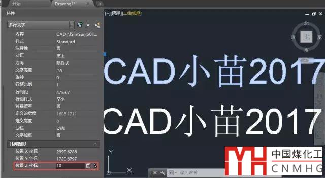 2、 選中文字,輸入CO,回車,復制一份文字到上方。選中復制的文字,打開特性面板(CTRL+1),在特性面板中將Z坐標設置為10,如下圖所示。