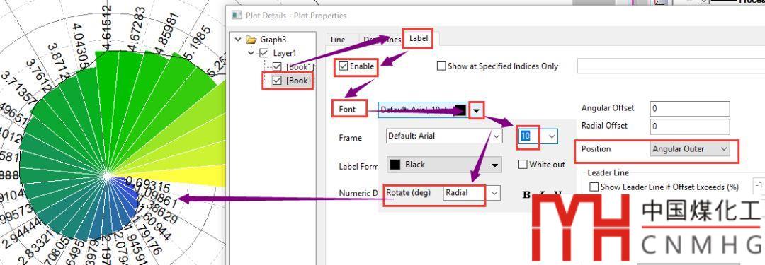 雙擊添加的曲線進入Plot Properties對話框,切換到Label頁面,點擊Enable,在Font中設(shè)置字號,Rotate設(shè)為Radial。同時Position設(shè)為Angular Outer。