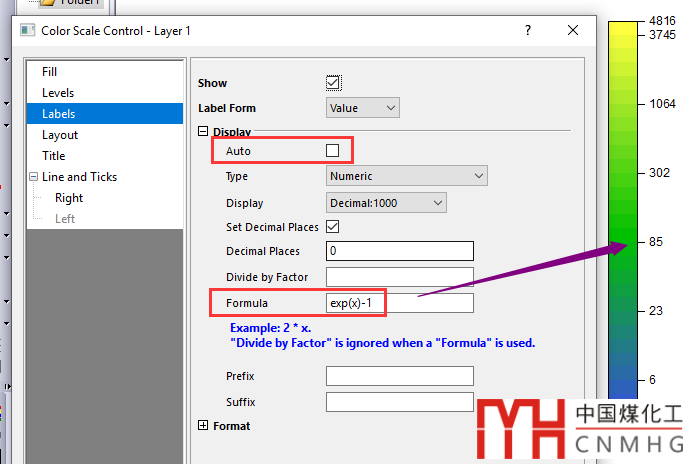 在Labels頁面,去掉Auto的勾選,Set Decimal Places設(shè)為0,并在Formula中填入”exp(x)-1“。之所以填這個表達式,是因為最開始的數(shù)據(jù)處理中使用的“ln(C+1)”,此處填入的恰是其反函數(shù)。