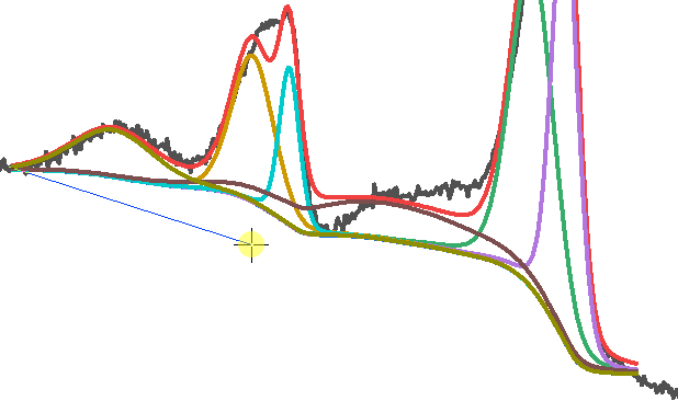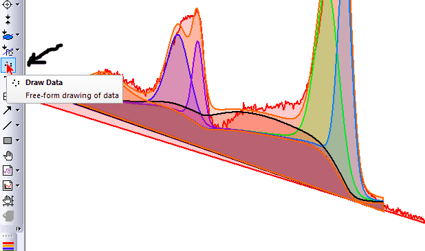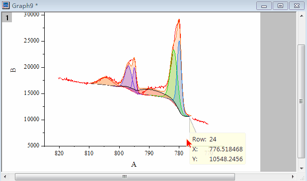 我們需要在擬合峰數(shù)據(jù)的兩端補(bǔ)充一個(gè)數(shù)據(jù)點(diǎn),這個(gè)數(shù)據(jù)點(diǎn)的位置稍微靠下一點(diǎn),這樣可以使每條擬合曲線的線下封閉填充時(shí)越過(guò)交叉區(qū)域。所以我們用畫(huà)線工具從起點(diǎn)畫(huà)到終點(diǎn),與最低點(diǎn)相切,然后讀取線段末端的坐標(biāo)(X,Y),將每一條曲線的末端增加一個(gè)數(shù)據(jù)點(diǎn)(X,Y).