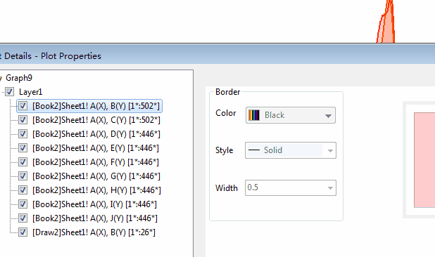 圖中,紅色線是測(cè)試數(shù)據(jù),我們不需要將它填充,因此需要單獨(dú)對(duì)它設(shè)置:雙擊曲線,在Layer1中點(diǎn)擊第一條曲線,再點(diǎn)擊Group中的independent(單獨(dú)),然后在Line中去除fill的勾選。