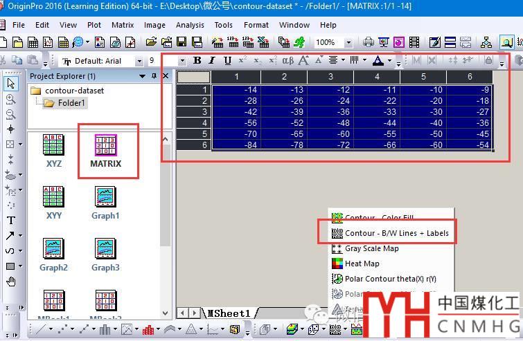 Matrix格式的數(shù)據(jù)與XYZ格式的數(shù)據(jù)一樣, 點(diǎn)擊一下Contour -B/W Lines + Labels即可。