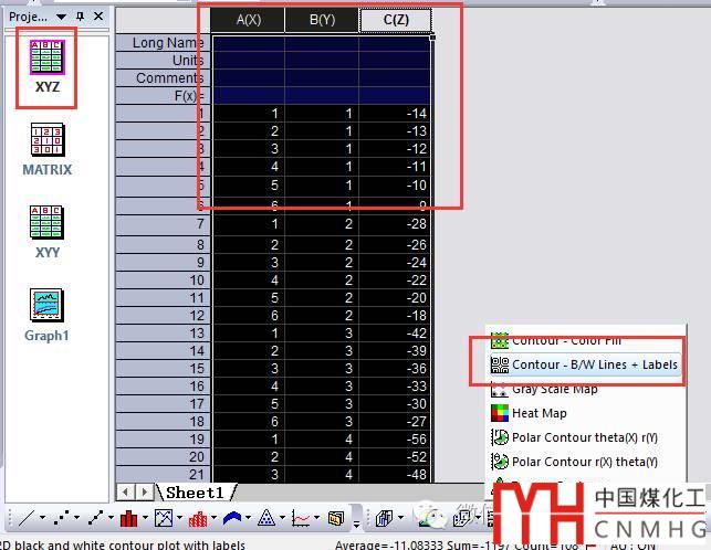 XYZ格式的數(shù)據(jù)繪制Contour圖很簡(jiǎn)單,點(diǎn)擊一下Contour -B/W Lines + Labels即可。
