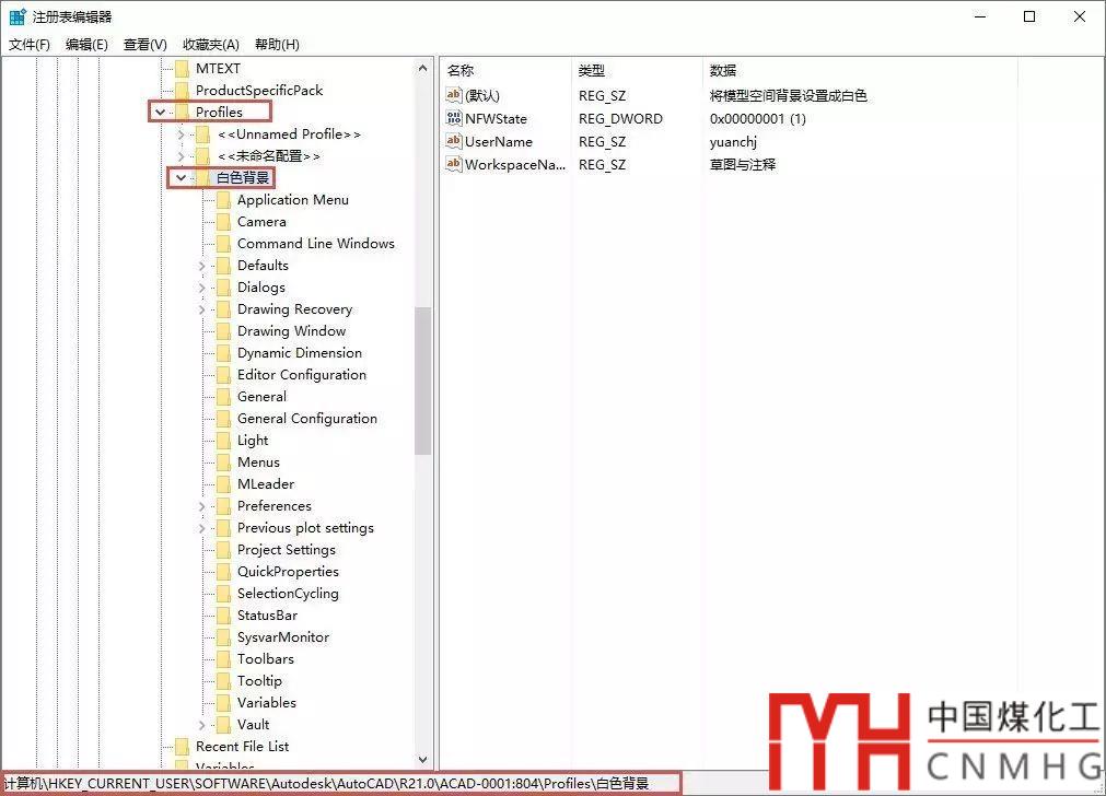 在注冊(cè)表的HKEY_CURRENT_USERSOFTWAREAutodesk中找到AUTOCAD的Profiles注冊(cè)表項(xiàng),如下圖所示。