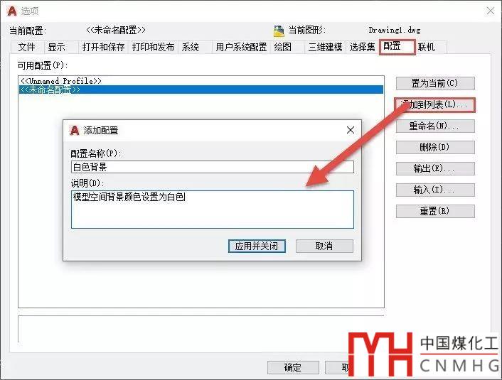 輸入OP,回車,打開(kāi)選項(xiàng)對(duì)話框,切換到配置選項(xiàng)卡,單擊“添加到列表”按鈕,在添加配置對(duì)話框中給配置取名為“白色背景”,如果需要還可以添加說(shuō)明文字,如下圖所示。