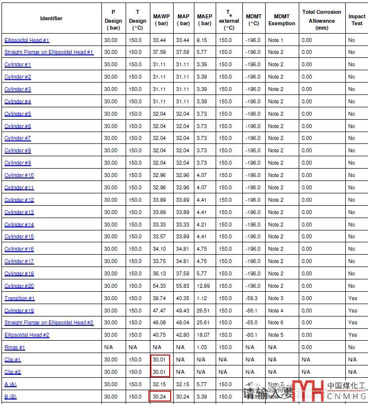 標(biāo)準(zhǔn)中并未規(guī)定不能由哪部分控制MAWP,但經(jīng)常會有公司規(guī)定不能有開孔補(bǔ)強(qiáng)控制或不能有開孔補(bǔ)強(qiáng)和標(biāo)準(zhǔn)管法蘭控制MAWP。理論上說可以計算出當(dāng)前設(shè)備的最接近真實的MAWP。見下圖(由于控制MAWP的在截圖之外的接管上,所以出現(xiàn)clip的最低;compress軟件的計算書)
