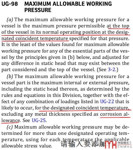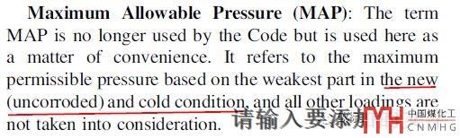 MAWP在UG-98有明確的定義和解釋。沒啥好解釋的就是腐蝕后的設(shè)計溫度下的,可以直接理解為替換設(shè)計壓力的。和MAP對應(yīng)著解釋就是舊的和熱的(hot and corroded)。