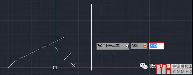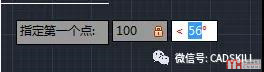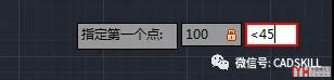 1、假設(shè)我們繪制直線,在確定第一點(diǎn)坐標(biāo)的時(shí)候就輸入極坐標(biāo)100<45。當(dāng)我們輸入完100后如果輸入<符號(hào),會(huì)自動(dòng)切換到下一個(gè)輸入框,并且會(huì)提示我們輸入的是角度,如下圖所示。