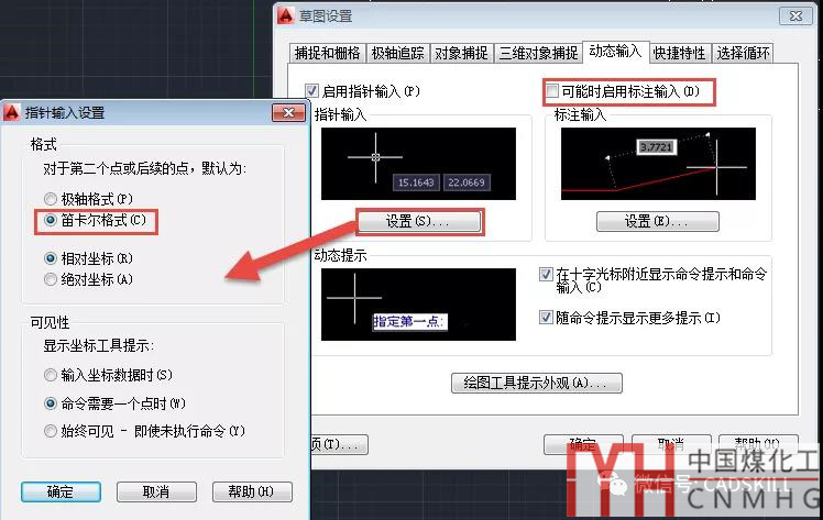 2、假如動(dòng)態(tài)輸入的指針輸入設(shè)置的是笛卡爾坐標(biāo),而且關(guān)閉了“標(biāo)注輸入”,如下圖所示。