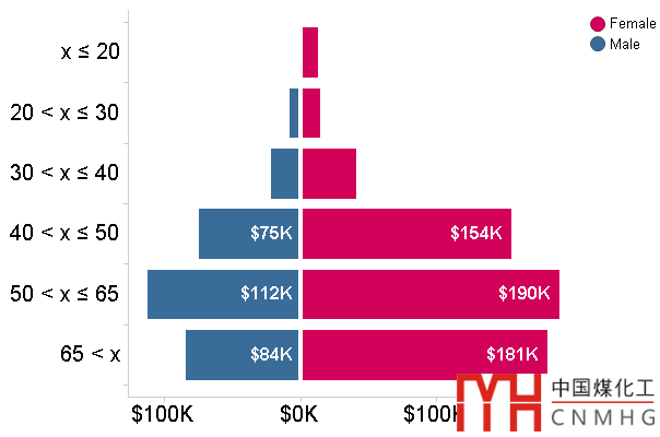 用于表示兩個(gè)不同組別(左右兩個(gè)部分)在不同分組時(shí)段的取值情況。例圖中,左右兩個(gè)部分分別表示男性和女性,縱軸的分組表示不同的年齡段,橫軸則表示購(gòu)買(mǎi)力。