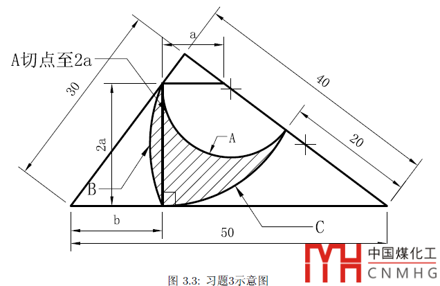 這張圖關鍵是已知條件的a和2a這個兩倍的關系,另外注意AB兩條圓弧的圓心都在右側的直角邊上,這個相切條件可以在用三點畫圓的時候捕捉直角邊的垂點。圓弧C與底邊相切,可以直接用起點、端點、方向來繪制。