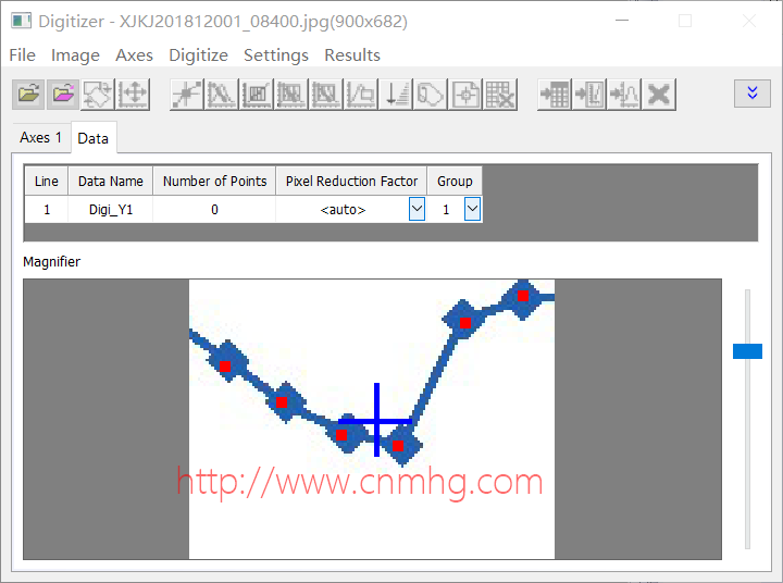 Step3:默認(rèn)進(jìn)入坐標(biāo)軸設(shè)置界面,通過點擊拖動的方式可以調(diào)節(jié)紅線和藍(lán)線(藍(lán)為原點,紅為終點)與圖像中坐標(biāo)軸重合,用來定標(biāo)點的位置,然后在Axis Values中設(shè)置坐標(biāo)起點和終點代表的數(shù)據(jù)值;