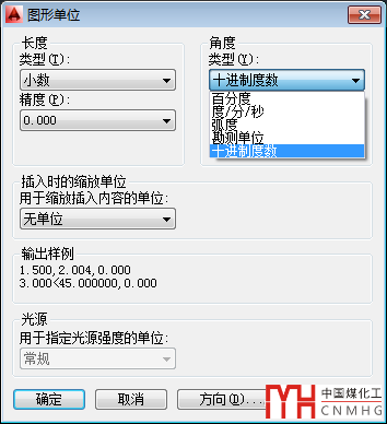 輸入UNITS,打開單位對話框,可以看到角度的單位設(shè)置確實用的是弧度,如下圖所示。