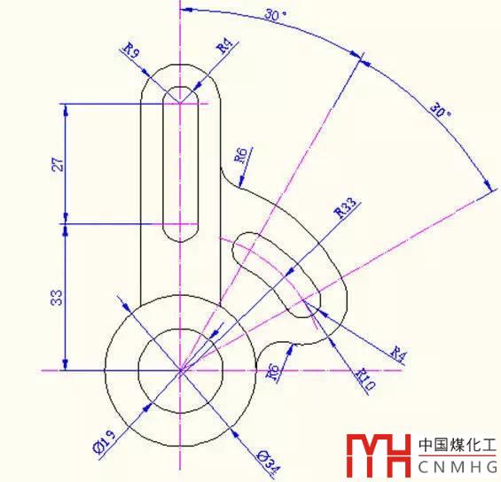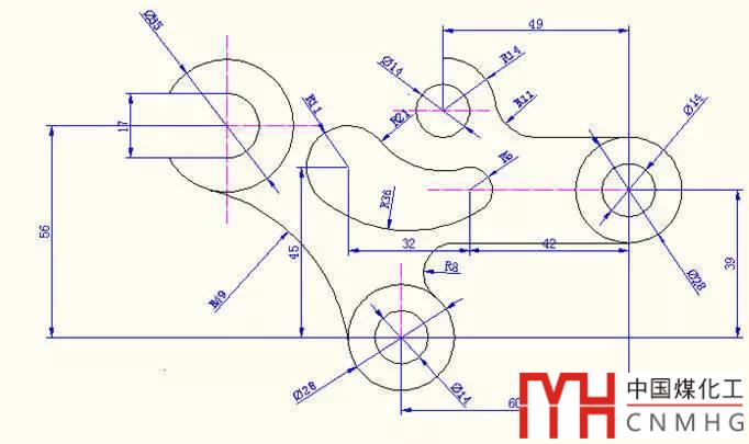 審圖:需要三個圖層,分別為繪圖、尺寸標(biāo)注、輔助線圖層圖層;本圖主要是圓的相切和多余圓弧的修剪,相關(guān)圓的輔助線、圓心、半徑的確定。