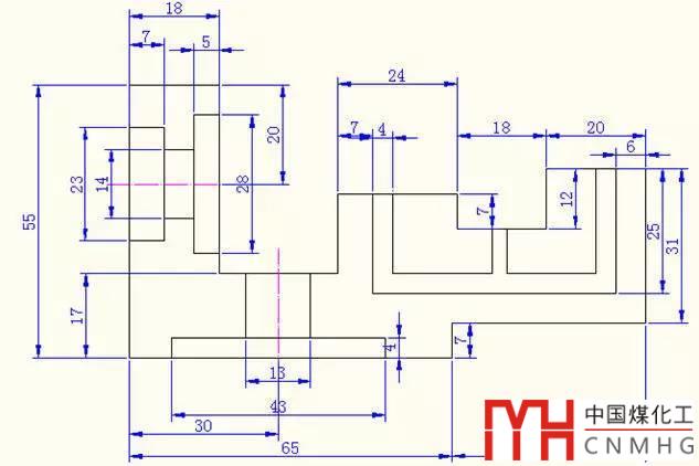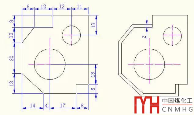 繪圖步驟:建立三個圖層,分別為繪圖、尺寸標(biāo)注、輔助線圖層,由點(diǎn)(14,0)開始依次畫出各個外框線段,計(jì)算兩圓的圓心坐標(biāo)畫圓;把左邊的圖通過復(fù)制再通過偏移相關(guān)線條和修剪多余線條完成繪圖;最后進(jìn)行尺寸標(biāo)注。