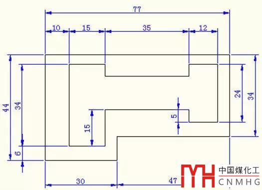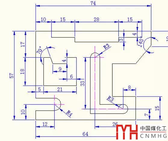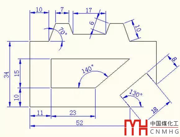 繪圖步驟:建立三個圖層,分別為繪圖、尺寸標(biāo)注、輔助線圖層;繪制輔助線,利用計(jì)算的坐標(biāo)和原圖給的相應(yīng)線段尺寸完成外框;里面的圖形可通過計(jì)算相對偏移量來進(jìn)行相應(yīng)的偏移即可依次完成各線段的畫法,修剪多余線段;最后進(jìn)行尺寸標(biāo)注。