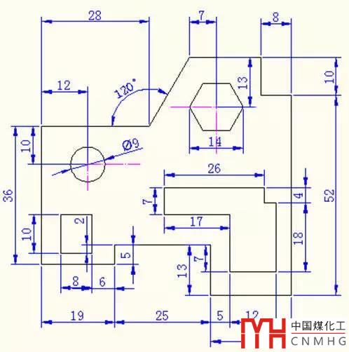 審圖:此圖包括外框、里面的一個圓、一個正六邊形、一個矩形框、一個多線段框,每個部分都可以計(jì)算其坐標(biāo)和相應(yīng)尺寸;圖層有三個,分別為繪圖、尺寸標(biāo)注、輔助線圖層。