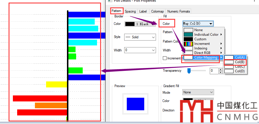 雙擊打開樣式設(shè)置面板,顏色選擇color mapping,值為col(B),即橫軸的數(shù)據(jù)。