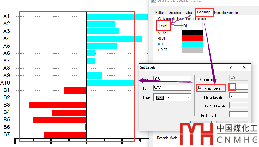 切換到colormap標(biāo)簽,點(diǎn)擊Levels,設(shè)置main levels為2,即兩種顏色。