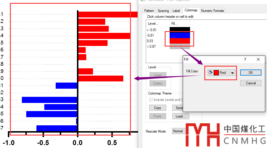 關(guān)鍵步驟,調(diào)整條形圖的顏色,大于0的為紅色,小于0的為藍(lán)色。