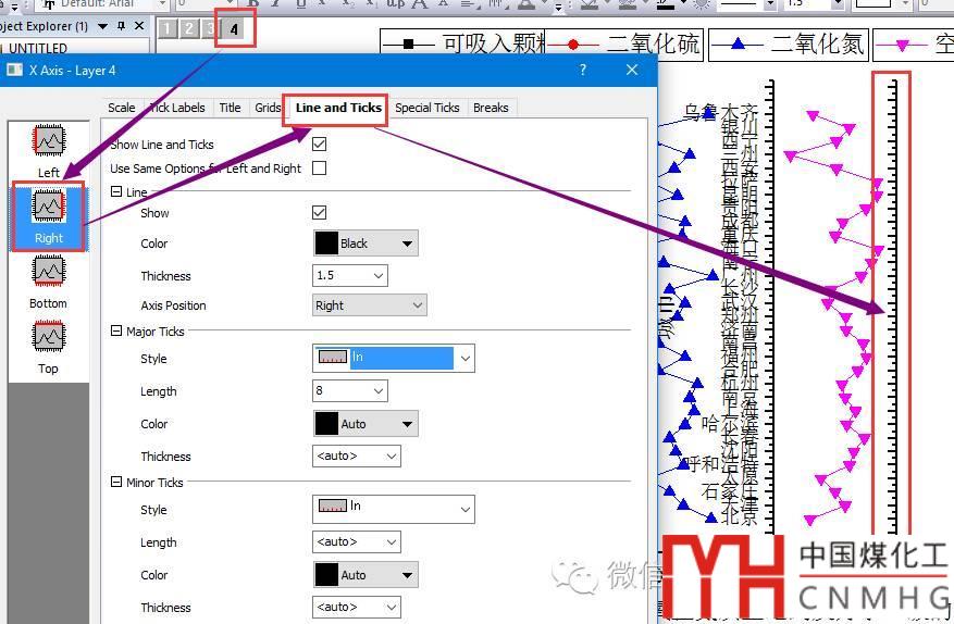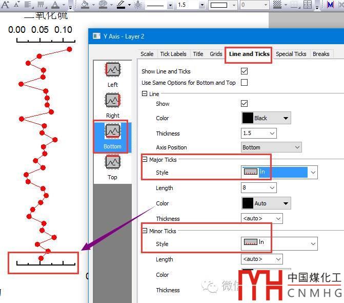 刪除圖層2底部坐標(biāo)軸的標(biāo)題與標(biāo)簽,其Ticks方向?yàn)?strong>In