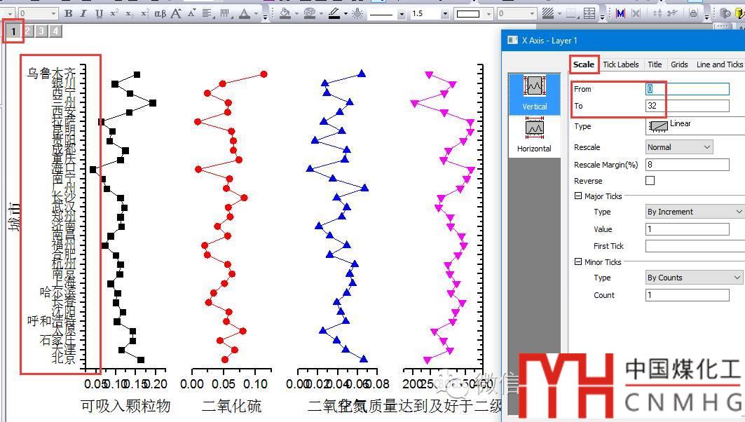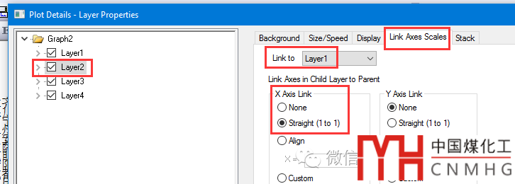 調(diào)整圖層1左側(cè)坐標(biāo)軸的范圍為0~32,其他圖層會(huì)自動(dòng)調(diào)整,因?yàn)榍懊嬉呀?jīng)將圖層2-4鏈接到圖層1,其X軸的范圍設(shè)置為Straight (1 to 1)