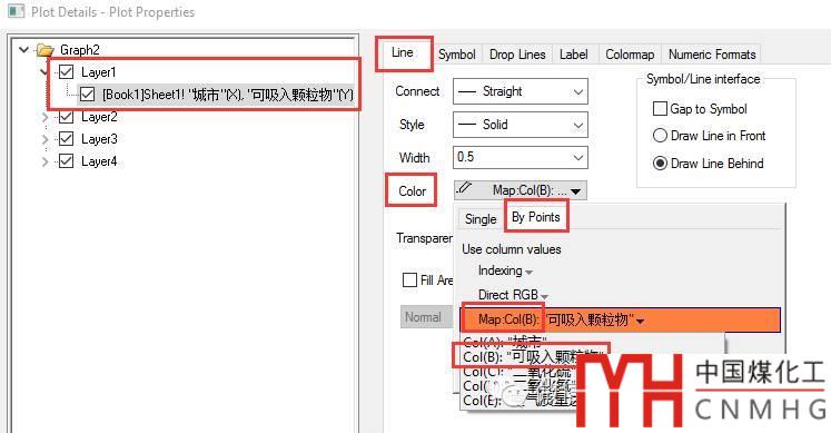 設(shè)置各個(gè)圖層中Line+Symbol圖的顏色,使用相應(yīng)圖形的Y列數(shù)據(jù)來Mapping上色。