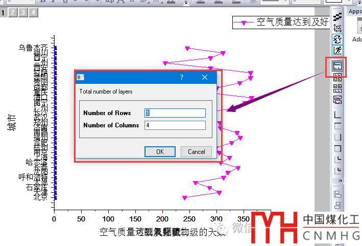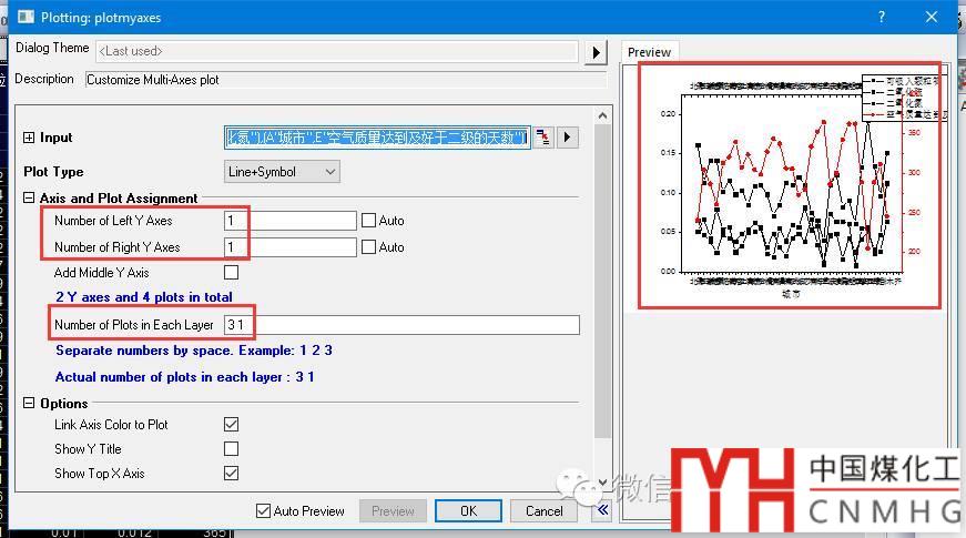 【關(guān)鍵步驟】在設(shè)置對(duì)話框中,左右Y軸個(gè)數(shù)均為1(Double-Y),Number of Plots in Each Layer設(shè)置為“3 1”(中間為空格)!