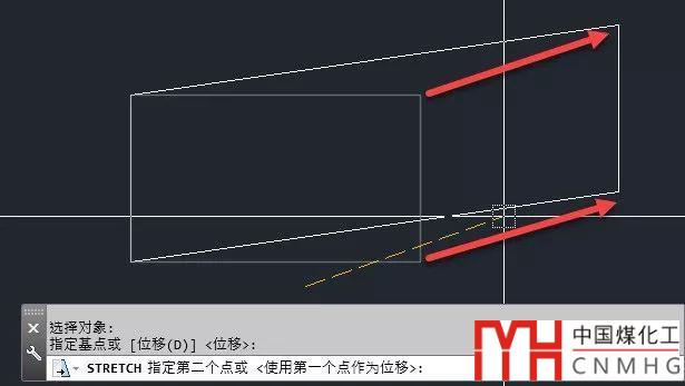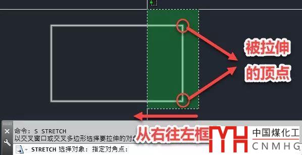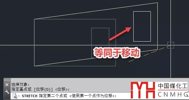選擇完圖形或頂點(diǎn),回車確認(rèn)后,拉伸的選項(xiàng)跟移動(dòng)完全相同,也分基點(diǎn)目標(biāo)點(diǎn)和位移方式,后續(xù)的操作跟移動(dòng)一樣,可以參看之前關(guān)于移動(dòng)的介紹。
