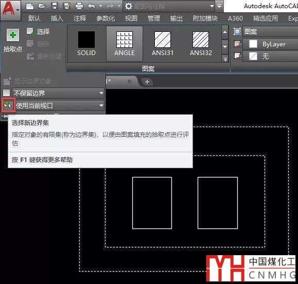 二、建立邊界集。默認(rèn)的邊界集是當(dāng)前視口內(nèi)的所有對象,通過選擇圖中部分對象作為填充的邊界集可以簡化填充計(jì)算,提升填充的速度。我們可以預(yù)設(shè)哪些圖形參與填充計(jì)算,不在選擇集內(nèi)的對象不處理。在這張圖里我們就可以創(chuàng)建一個包括兩個大矩形的邊界集,然后即使在兩個矩形間拾取點(diǎn),兩個小矩形也不會參與計(jì)算了。高版本的填充上下文面板中建立邊界集的按鈕隱藏得比較深,不太好找,如下圖所示。