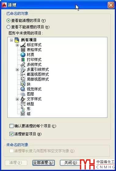 我們執(zhí)行清理:PURGE(PU)命令,打開(kāi)清理對(duì)話框,就可以知道可清理的數(shù)據(jù)到底有哪些,如下圖所示。