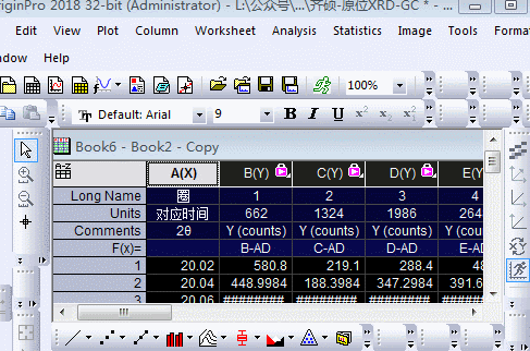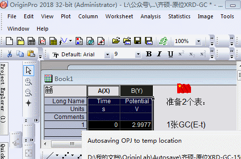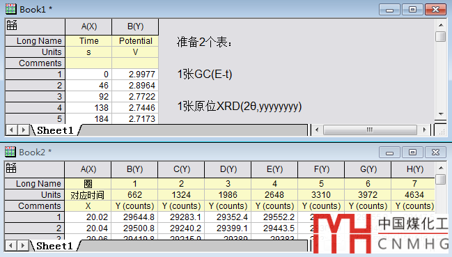 準備兩張表:GC數(shù)據表、原位XRD數(shù)據。GC數(shù)據表通常為t、E兩列數(shù)據集
