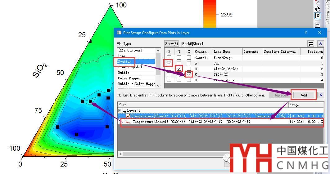 點擊選擇左側(cè)框中的Scatter,勾選右側(cè)框中的XYZ,再點擊右邊的Add按鈕,將Scatter圖添加到Ternary Contour圖中。