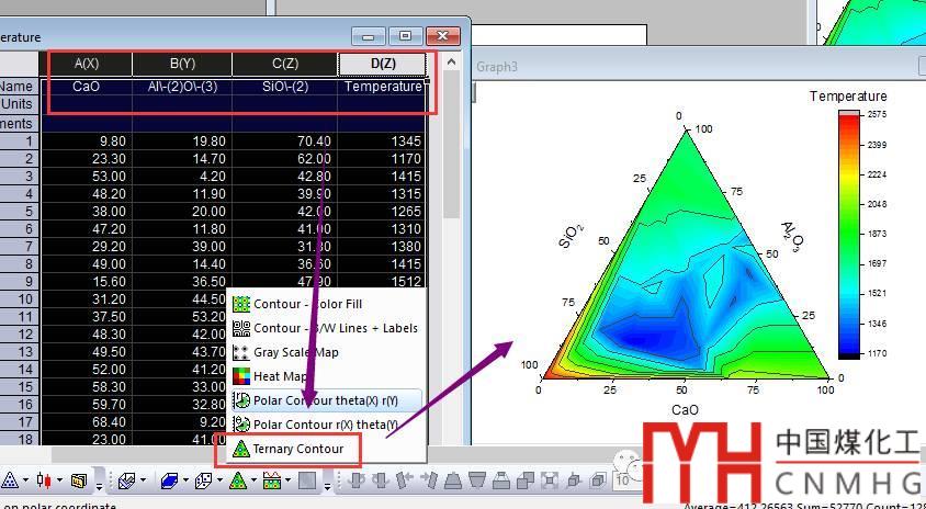 使用四列數(shù)據(jù)XYZZ可以繪制Ternary Contour圖,其顏色變化表示的就是溫度的分布。