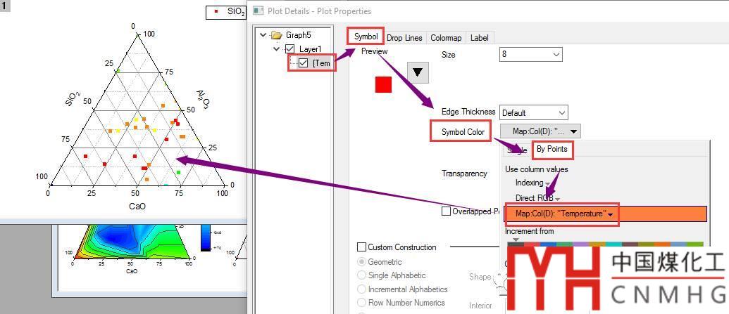 雙擊打開Plot Properties窗口,將Symbol標簽頁下的SYmbol Color設(shè)為By points->Color Mapping,選擇Col(D):Temperature。