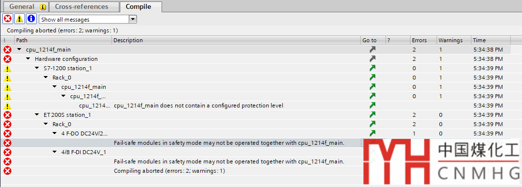 問題一:關(guān)于“Fail-safe modules in safety mode may not be operated together with cpu1214f_main”編譯錯誤