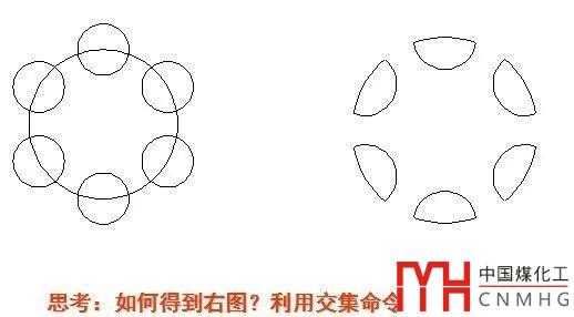 分析上面的圖形,最終保留的是大圓和每個小圓的交集,很多人想的比較簡單:直接將圓都轉成面域REGION,然后直接用相交INTERSECT命令,將大圓和小圓一起選中。結果發(fā)現最終什么都沒有了,因為相交是所有選定圖形的重疊區(qū)域,由于小圓之間沒有重疊,所以最后相交的結果為空。如果做成面域后直接用交集命令,只能選擇大圓和一個小圓進行相交,我們可以算出一個區(qū)域后以大圓的圓心為中心進行陣列。但既然大圓和小圓都已經畫出來,小圓已經陣列過一回了,我們就沒有必要再陣列一次了。要想用一次交集完成圖形的編輯,可以按照下面的思路進行操作: