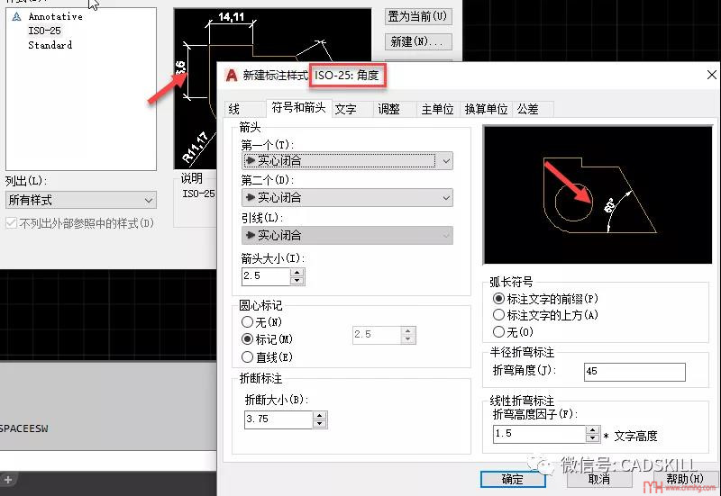 6、單擊“繼續(xù)”,關(guān)閉創(chuàng)建新標(biāo)注樣式對話框,進(jìn)入“新建標(biāo)注樣式”對話框,可以看到標(biāo)注樣式名稱顯示的是:ISO-25:角度,將箭頭改成實(shí)心箭頭,如下圖所示。
