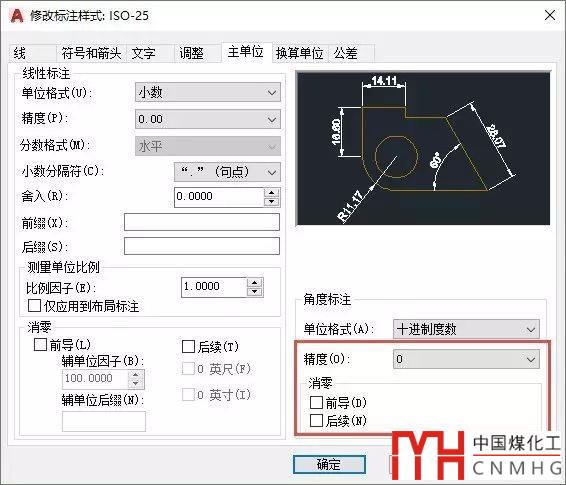 上面說的精度、舍入、消零都是針對線性的標(biāo)注的,角度標(biāo)注也有精度和消零的設(shè)置,但沒有舍入的設(shè)置,如圖所示。