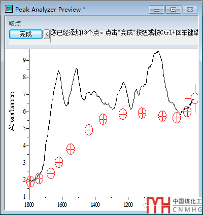點(diǎn)擊添加后,上圖窗口自動(dòng)消失,鼠標(biāo)變?yōu)槭中?,我們可以在基線附近依次雙擊,繪制基線,最后點(diǎn)擊“完成”返回“峰值分析”對(duì)話框。
