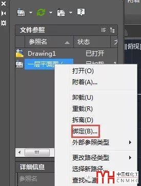 外部參照在圖紙中的很多表現(xiàn)跟圖塊很像,如可以作為整體進(jìn)行操作,可以用XC命令裁剪、可以用參照編輯REFEDIT功能編輯,而且不能跟圖塊重名。外部參照還可以轉(zhuǎn)換為塊,執(zhí)行XREF命令,打開(kāi)外部參照管理器(不同版本CAD中的外部參照管理器略有不同),選中外部參照?qǐng)D紙,然后點(diǎn)綁定,就可以將外部參照轉(zhuǎn)換為圖塊,如下圖所示: