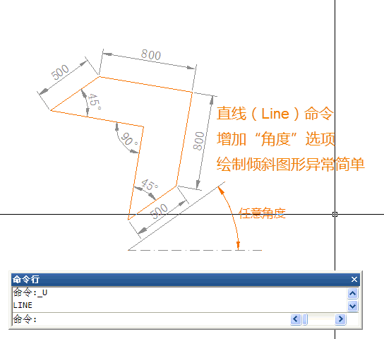 如果圖中直接給出的是直線與X軸正向的夾角和長度,這個估計初學者都會,直接用極坐標就可以。確定第一點后,輸入相對極坐標@長度<角度,例如輸入@10<45。