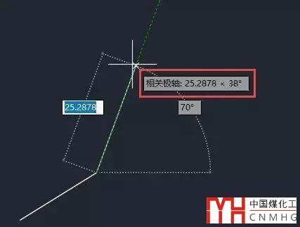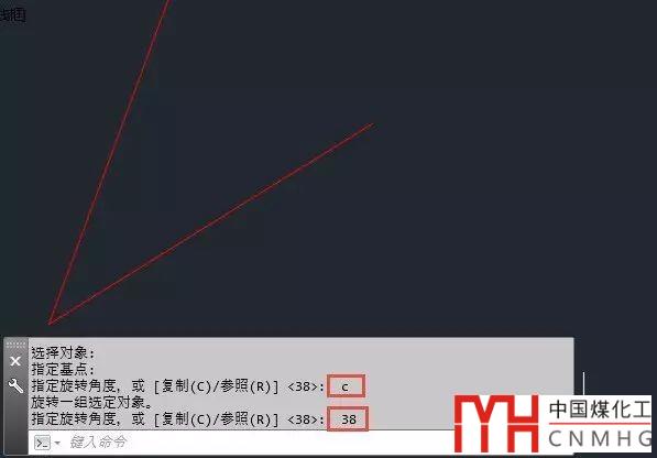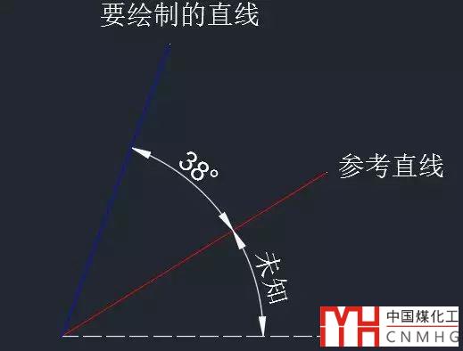 2、 輸入C,回車,輸入38度,就可以得到與參考直線夾角38度,長度相等的直線,如下圖所示。