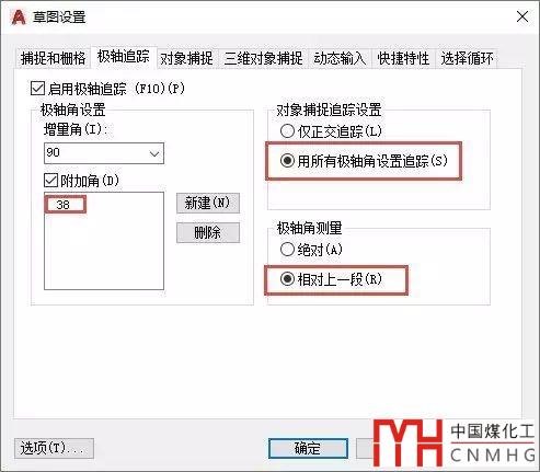 CAD的極軸可以設(shè)置增量角,這個增量角可以是相對于X軸正向的,也可以設(shè)置成相對上一段,如果兩條直線間的夾角是15、22.5、30或45度這樣角度的整數(shù)倍數(shù),可以設(shè)置附加角,然后將極軸角測量設(shè)置為相對上一段,如下圖所示。