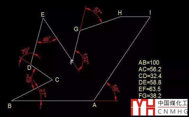 如果圖形只給出了角度,需要其他圖形來確定長度,比如上面例圖中的AI,I點的位置是通過H點來確定的。既然不知道長度,可以先預設(shè)一個長度來輸入極坐標,比如輸入@200<56,也可以在畫直線時先輸入角度:<56,再拖動光標來確定一個相對比較合理的長度。