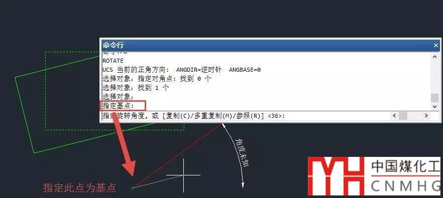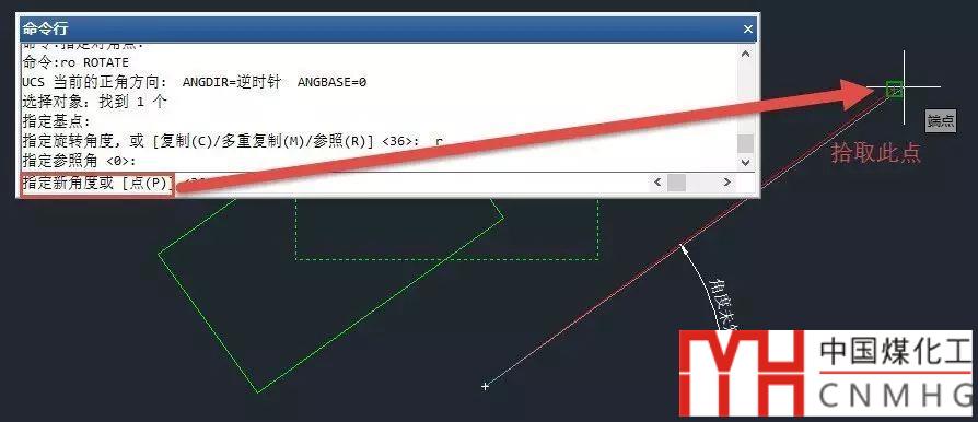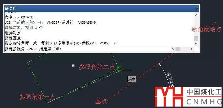輸入R回車,軟件會提示輸入?yún)⒄战?,默認角度為0,也就是水平方向,因為矩形是水平的,我們可以直接回車,軟件會提示輸入新角度,如下圖所示。