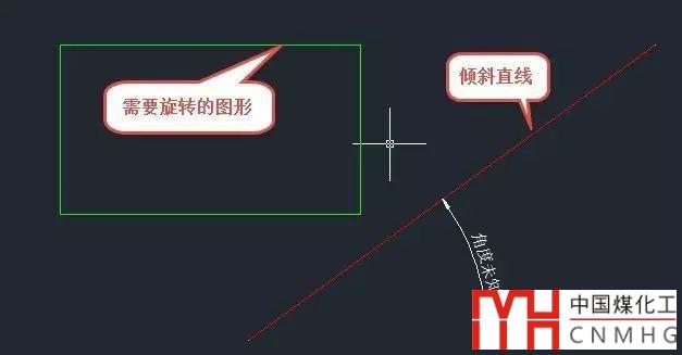 假設圖中有一條斜線,傾斜角度并不清楚,如果我們想旋轉一水平圖形與此斜線平行該怎么辦?如下圖所示。我們可以先測量斜線的角度,然后再旋轉水平圖形,但斜線的角度如果并不是整數(shù),這種旋轉就會有一定的誤差。
