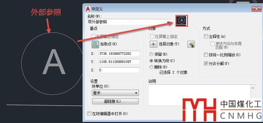 3、在圖紙中隨意畫一個(gè)圖形,然后將圖形跟外部參照一起選中,輸入B,回車,創(chuàng)建成一個(gè)圖塊,如下圖所示。